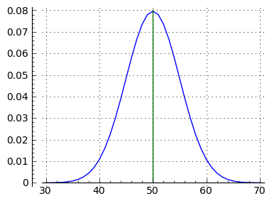 It seems that about 73% of the trial outcomes produce between 45 and 55 successes. Those familiar with the statistics of coin tosses may realize that by setting bounds like this we're sampling an underlying normal distribution that describes this class of outcome. Figure 2 shows a normal distribution (acquired with successive applications of the PMF function above), and below is a table, generated using the range form (a <= k <= b) above, that lists more sampling ranges and results:
