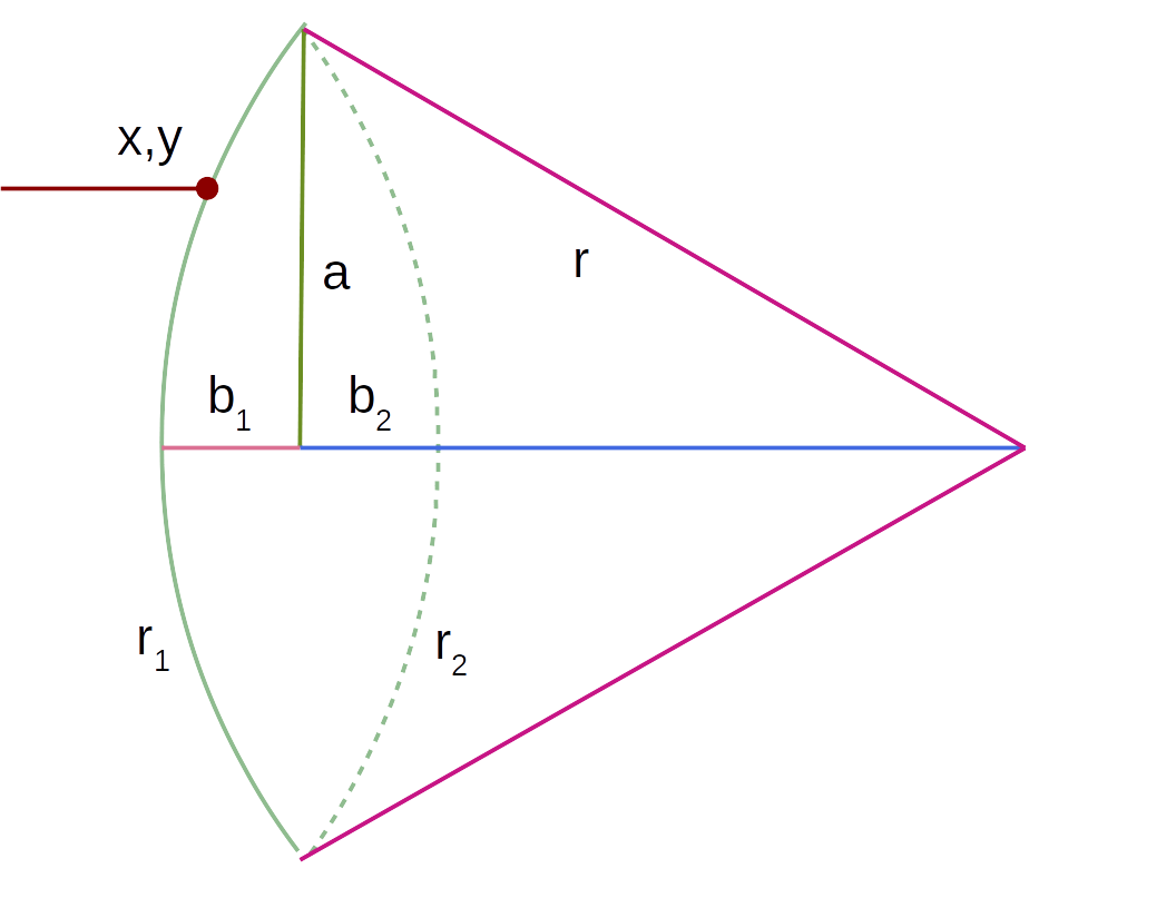 Initially, and referring to Figure 29, in practice we have access to $a$ (major radius, distance from lens center to edge) and $b$ (minor radius, distance from lens center to one face), values easily acquired by measuring the lens itself. With these values, we can compute: