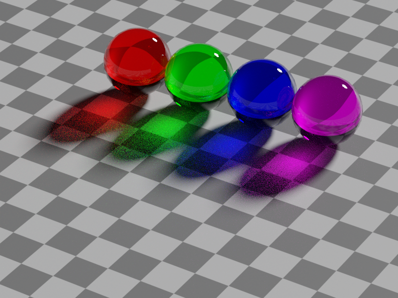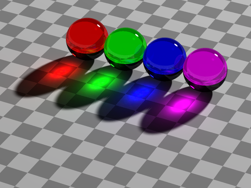 POV-Ray and other pure ray-tracing programs render optical paths as shown. Notice how the light passes through the glass spheres then converges to a focus, just like in reality.