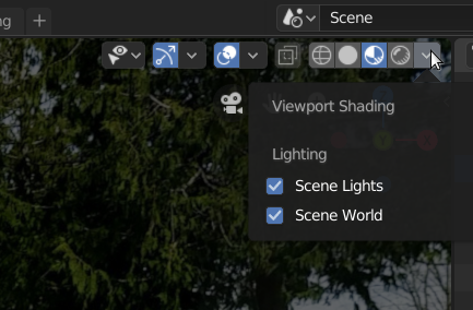 - To make this world environment appear in the layout 3D view, locate a little down-arrow at the upper right, click it, and check two options: "Scene Lights" and "Scene World". The desired setting should look like this:
