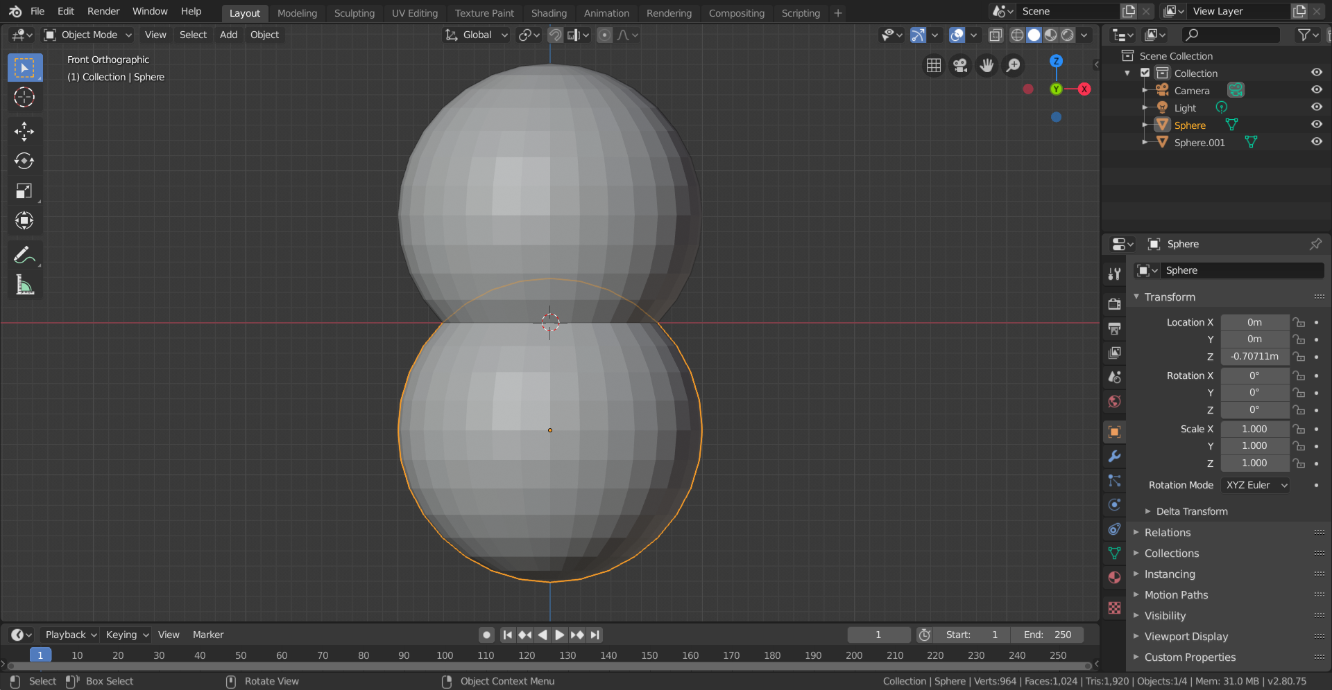 - Select the other sphere (which should now be visible) and move it to (0,0,-.707106), in other words, the same offset in the other direction. You should now see this:
