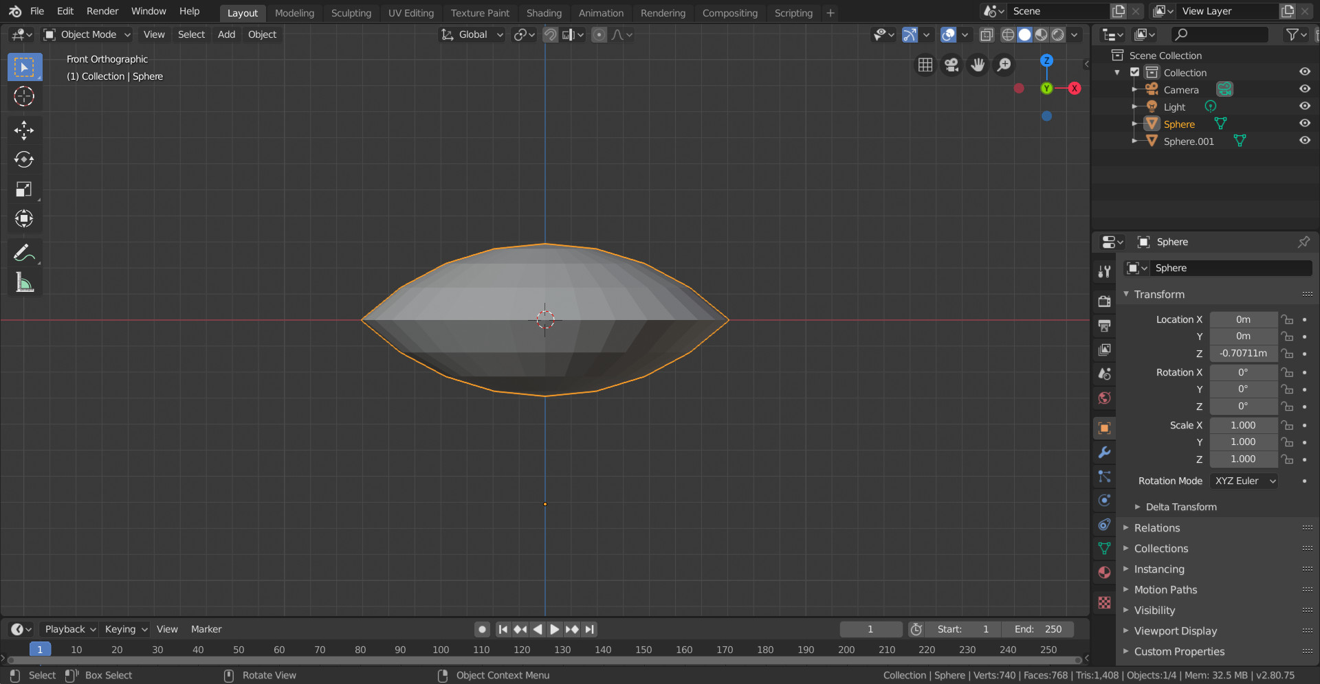 - Select the visible sphere (so it's surrounded by an orange circle) and go to the position tab in the properties editor. Move this sphere to position (0,0,.707106).