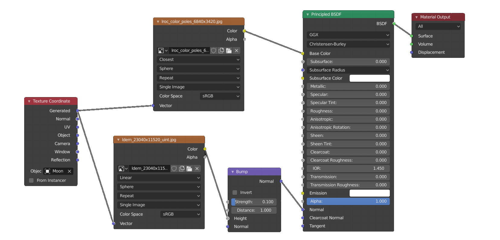 - The two Image Textures are synchronized with the sphere's polar coordinates by a Texture Coordinate node (red top bar at the left).