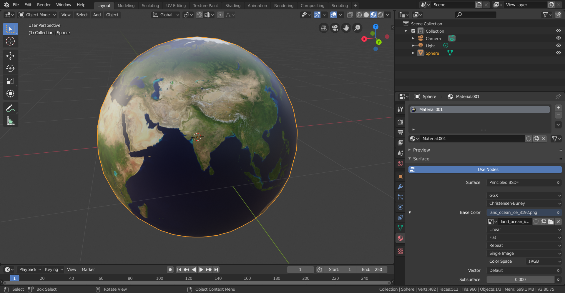 Here's how to map the Earth surface detail image, acquired above, onto the sphere we created earlier: