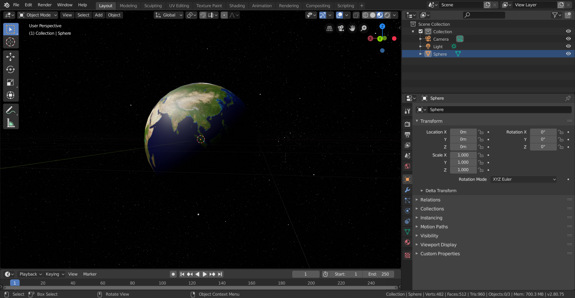 At this point, if you click "Play" or press the keyboard space bar, the animation should begin. Beginning slowly, then gradually speeding up, the planet will make one full rotation before slowing to a stop — then it will repeat the same sequence.