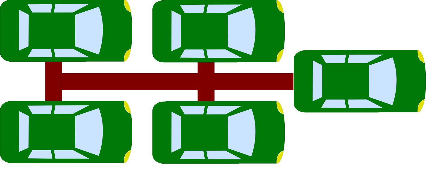 By being connected, the five individual four-ton SUVs have become a vehicle that weighs 20 tons, has 20 tires, and stops in the same distance as one SUV.