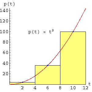 While examining Graph 4, pay attention to the rectangle at the right, the one lying between t = 8 and t = 12. Notice that a large part of this rectangle is above the function's curve (at the left), while much of the right side is below the curve. This may seem to undermine the goal of accurately estimating the area under the curve, until one realizes that the area outside the function's curve at the left may be thought of as a triangle, one that can be rotated clockwise through 180 degrees, pivoting around the blue dot at t = 10, and placed on top of the rectangle at the right. This same argument applies to the other rectangles, making them seem more appropriate as stepwise approximations of the curve's area than it may appear at first glance.