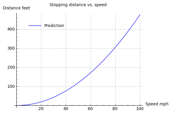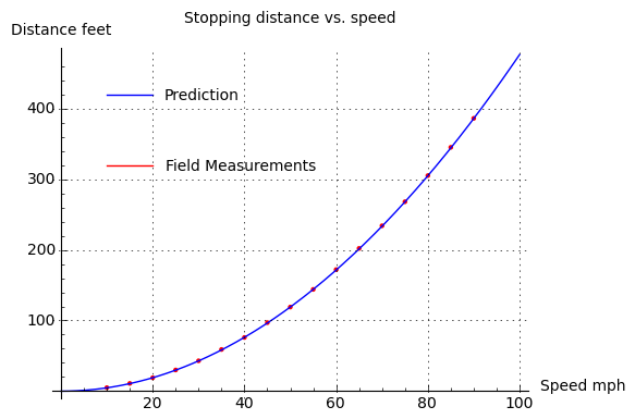 Speed mph Predicted stopping distance feet 10.00 4.76 15.00 10.71 20.00 19.05 25.00 29.76 30.00 42.86 35.00 58.33 40.00 76.19 45.00 96.43 50.00 119.05 55.00 144.05 60.00 171.43 65.00 201.19 70.00 233.33 75.00 267.86 80.00 304.76 85.00 344.05 90.00 385.71 Now that we have a table of predictions for speeds we haven't actually measured, we can consult an online source of data derived from field-measured stopping distances, and see how well our predictions hold up: