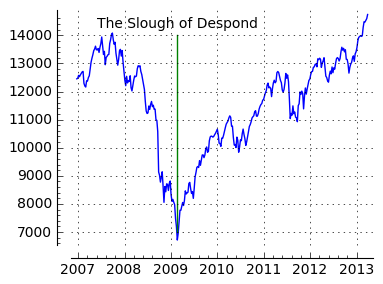 I know a woman whose parents lived through the Great Depression. About the time of the most recent market low point (Figure 2, "Slough of Despond"), she asked me for advice — should she liquidate her stock holdings to avoid more loss? I assured her the market would recover, that professionals were loading up on bargains, and she should be patient. Instead, about mid-March 2009, she panicked and sold everything. As Figure 2 shows, it was the worst possible moment to sell. She should have adopted the contrarian outlook, or simply done nothing. It was an example where reacting, being "prudent" and "taking control", was exactly the wrong thing to do.