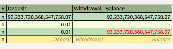 This doesn't mean one can enter a transaction dollar amount of 264 (18,446,744,073,709,551,616), because (a) the basis for GnuCash's internal numerical processing is the penny, not the dollar (true with appropriate terminology change for all supported currencies), and (b) a 64-bit signed integer (to allow for negative amounts) has a range of ± 263-1 (±9,223,372,036,854,775,807), which gives a maximum meaningful dollar transaction range of ±$92,233,720,368,547,758.07.