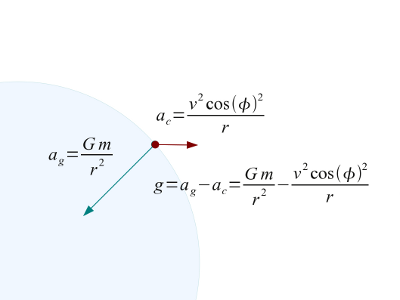 (4)   $\displaystyle g = \frac{Gm}{r^2} - \frac{(v\ cos(\phi))^2}{r\ cos(\phi)} cos(\phi) = \frac{Gm}{r^2} - \frac{v^2 cos(\phi)^2}{r}$