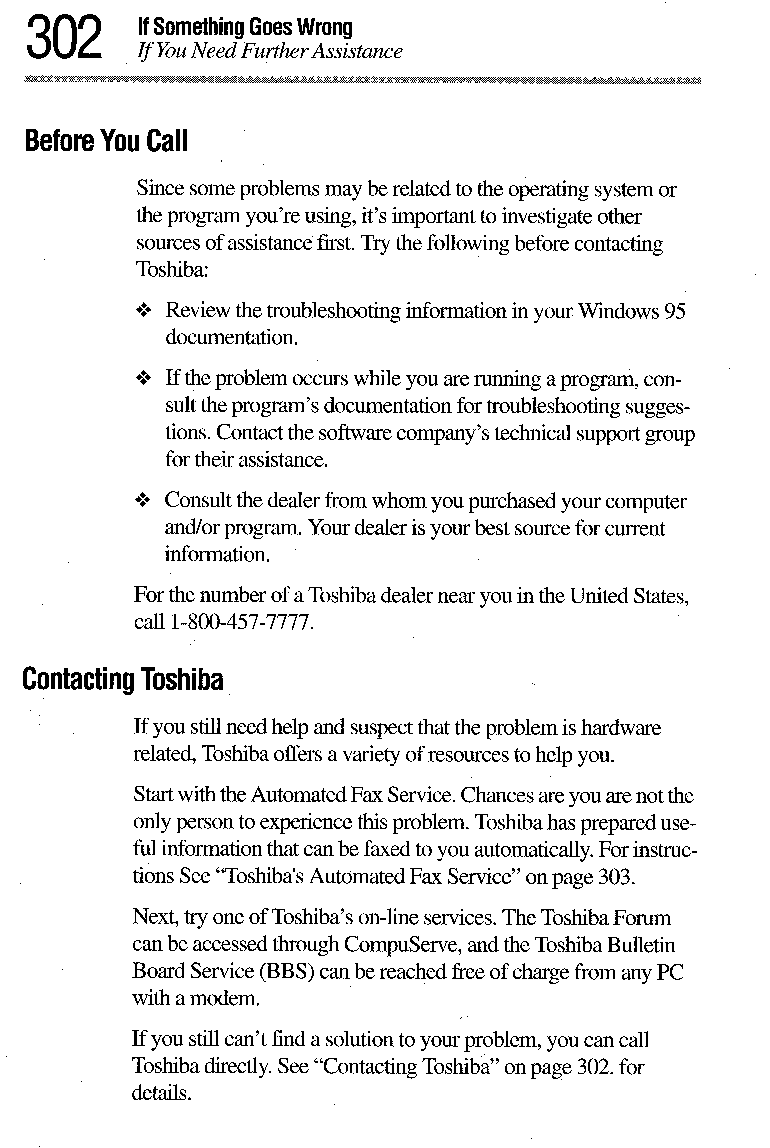 | This is page 302 of the Toshiba Satellite 220/225CDS portable computer manual. Your mission, if you are willing to accept it, is to find the promised support phone number, the one you use to talk to a human. If you are in a hurry, just read the last line on the page. |