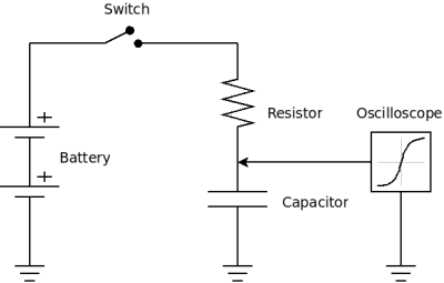 In this experiment, we have an electronic circuit consisting of a resistor and a capacitor. At time zero, we close a switch that connects our circuit to a battery, we then use an oscilloscope to measure the voltage on the capacitor over time (see diagram this page).