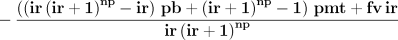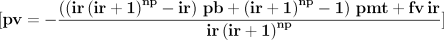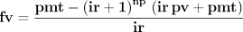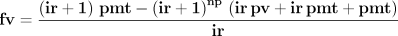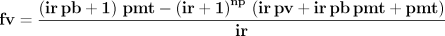 eq:fv=((pb*ir+1)*pmt-(ir+1)^np*((pb*ir*pmt)+pmt+ir*pv))/ir;