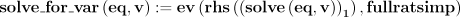 solve_for_var(eq,v) := ev(rhs(solve(eq,v)[1]),fullratsimp);
