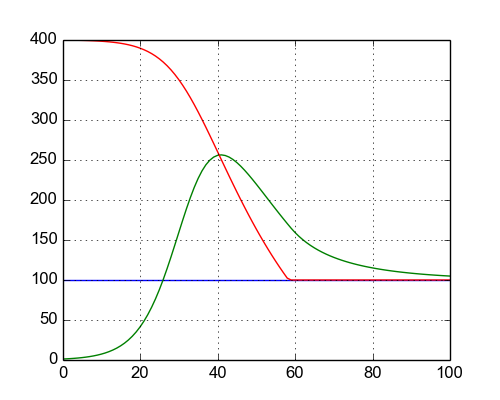 Examine the graph of equation (3). At the left (0 <= t <= 40), the curve shows the unconstrained growth of equation (2). In the middle the growth rate becomes linear as resource limitations become important, and at the right (60 <= t <= 100), environmental constraints prevent a population greater than carrying capacity k.