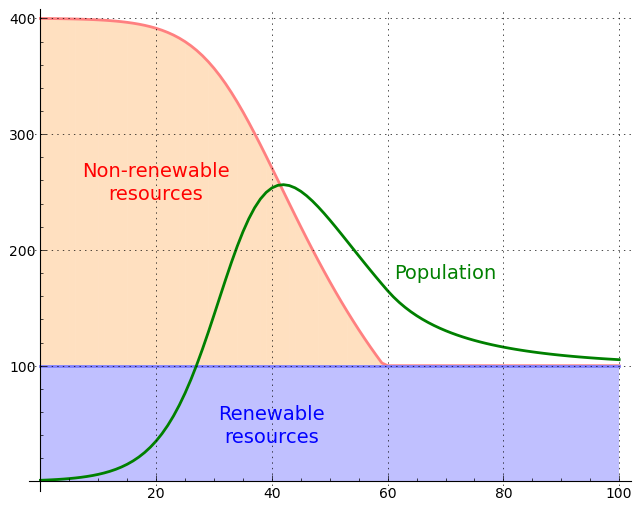 This section describes a mathematical model able to predict the behavior of an environment composed of a growing population and a mix of renewable and nonrenewable resources. It is derived from earlier mathematical work meant to model populations, in particular the Logistic function. The Logistic function is limited to describing the relationship between a growing population and a fixed resource limit, an approach having the advantage of being relatively simple, but with the drawback that it cannot accurately model many real-world biologiocal systems.