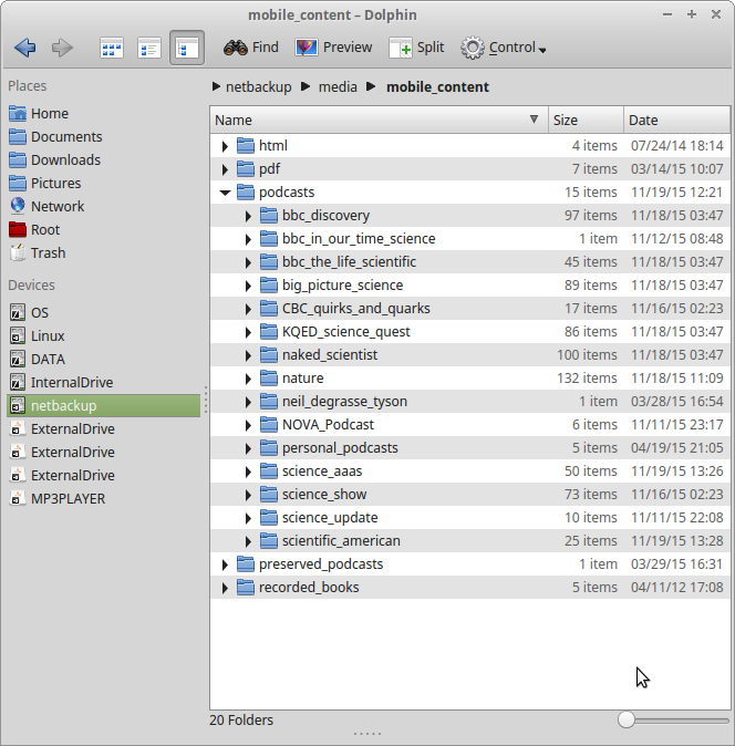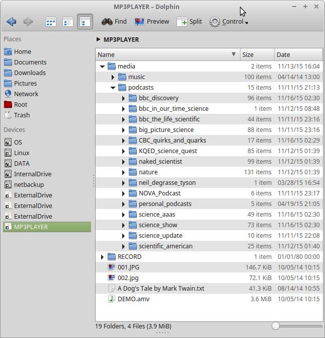 Some DetailsIn modern times this is a very simple task — just plug your MP3 player into your computer, at which point it should appear as a normal storage device. Then copy some of the podcast directories generated by PodcastRetriever from your desktop/laptop machine to the MP3 player. Here's a typical setup, with the source filesystem at the left and the MP3 player's filesystem at the right: