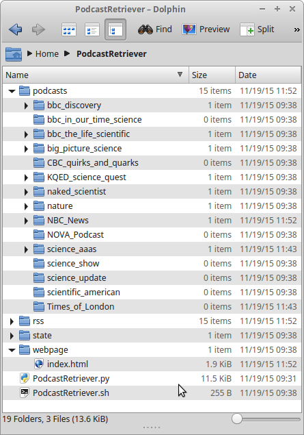 For the new program, I only need to locate an RSS feed URL and title for each podcast source, enter these into a table of values in my program, and run the program. PodcastRetriever then creates a storage subdirectory for each source (very useful for MP3 players) and fills it with podcasts that meet a date criterion that I also set (I usually limit downloads to the most recent calendar year, but this is an easily changed user option).