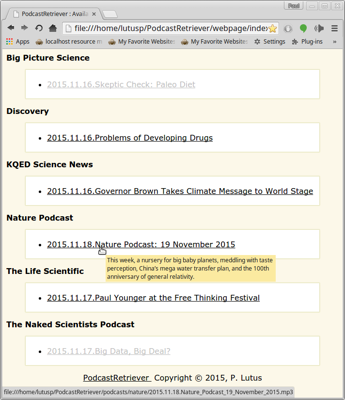 - In my example run, I chose a period of only a few days from the present date, so a handful of podcasts were downloaded, just enough for a test of the webpage that PodcastRetriever generates.