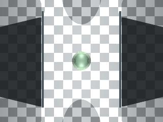 The astute reader will notice something about this example. If the plane makes a reflection, and if the sphere also makes a reflection, some of the reflections from the plane will hit the sphere and be reflected back to the plane, ad infinitum. How does the program ever stop running? The answer is that the renderer knows not to reflect infinitely many times. Click the third image down on this page to see the effect of an increase in the number of reflections. Notice that each image shows a black square, which is the distance (and number of recursions) at which POV-Ray stops reflecting light. And click here to show (and acquire) the POV-Ray scene description file responsible for this display. Notice in this listing, third line down from the top, the entry "max_trace_level 24". This entry is reponsible for the final, deepest level of reflections in the mirror experiment. I created the mirror experiment scene description file using KPovModeler. After a certain level of detail has passed, it becomes much easier to make a modeler program handle the details for you — this relegates the low-level tasks to a program, freeing the human to concentrate on the more creative aspects of this kind of work. Hey, wait a minute, that sounds like the reason to have a computer in the first place. :) Again, I ask that you perform some of your own experiments. Satisfy your curiosity about the properties of these scene description files. And get accustomed to visiting the POV-Ray documentation site for a greater level of detail than I provide here.