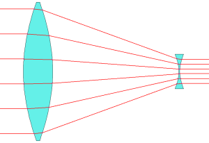 The color fringing in the view through the eyepiece of our simple telescope is a real effect, one that can be modeled using POV-Ray. This effect, called "chromatic aberration," is caused by the fact that light's speed through glass is wavelength-dependent. This wavelength dependence (called "dispersion") causes blue light to be refracted more than red light. In a POV-Ray source file, one can set a dispersion value in the "interior" block of a lens description, like this:ConclusionIn this entry, "ior" stands for Index of Refraction, which is the degree to which light is slowed down by that particular glass, while "dispersion" represents the degree to which the index of refraction is wavelength-dependent. For an in-depth discussion of these topics, read the Technical Discussion Page for OpticalRayTracer, my open-source ray tracing program. It was only over time that opticians figured out how to accommodate dispersion in their lens designs. Typically an optician will create two lenses composed of different kinds of glass, glass having different dispersion indices, and play one lens off against another to minimize this effect. There is an example design that shows this in the help file for OpticalRayTracer.interior { ior 1.5 dispersion 1.01 }