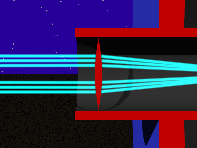 This telescope design represents a big leap in sophistication from the Galilean telescope of the previous page, and it represents the passage of many years in the history of astronomy and telescope design. In fact, this design is (more or less) one example of the sort of telescope presently owned by many advanced amateur astronomers as well as professionals. Please refer to the graphic images on this page. In this design:ConclusionThis design has many advantages over the prior design and is regarded as an advanced optical configuration, suitable for astronomical observation and photography. It hews to a basic optical principle by using an absolute minimum number of lenses. It is very difficult to control the various distortions caused by lenses in the optical path of a large-aperture telescope, and it is preferable to do nearly everything with mirrors. In fact, in many photographic applications, the eyepiece lens is eliminated and an image sensor (film or CCD) is placed at the focal point instead. My version of this design differs from a typical Cassegrain that one might purchase from a commercial builder of telescopes. In a commercial Cassegrain design (called a "Schmidt-Cassegrain"), a spherical primary mirror is used instead of parabolic, because spherical mirrors are much easier to figure, and the glass plate to the right is shaped to create the optical behavior that would have been obtained with a parabolic mirror. Overall this reduces the cost of manufacture, and the glass plate has the added purpose that it prevents entry of dust into the telescope. I own a 10" Schmidt-Cassegrain made by Meade and I have done quite a lot of observing over the years, so I am familiar with the various optical aspects of the design. Consequently I know when my virtual telescope is successfully imitating a real one. In creating a modern, virtual telescope like this, I had to overcome various problems. The primary problem was sorting out the various focal lengths so that a focused image would be present at the eyepiece. Another problem, one I had not anticipated and that I had some difficulty sorting out, was that in this telescope design there is an obstruction (caused by the secondary mirror) in the middle of the field of view. I found that if I simply centered my virtual camera along the eyepiece line, the image would be blocked by this obstruction. I knew I had performed all the required calculations, and there should have been a focused image where the camera was located. I solved this problem by using one of the more advanced features of POV-Ray called "focal blur." The original purpose of focal blur was to create the effect one sees in photography when using a camera with a relatively wide aperture. Under these conditions, objects at only one distance are in proper focus, objects at other distances are blurry. It turns out that POV-Ray accomplishes this effect by shooting many random rays from the confines of a user-determined circular aperture and summing the results. The user gets to specify the aperture (in essence the diameter of a lens) as well as the location of a plane at which all the rays cross. The latter becomes the focal distance. Using focal blur solved several problems. I was able to specify an aperture larger than the central obstruction, making it possible to create an image just as our eyes do (by integrating light rays across a given aperture), and I was able to specify various focal distances to imitate various eyesight conditions and their results in the overall design. Here is my POV-Ray eyepiece-camera definition that includes the needed focal-blur specifications: