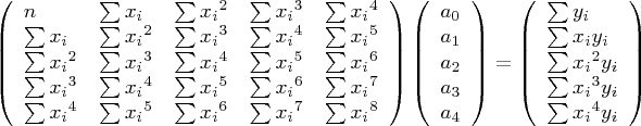 that is to say, the sum of the x values raised to the indicated power, where r equals the matrix row and c the matrix column, each such index in the range 0 <= i <= p, and n equal to the number of data samples. Note also that x0 = 1 and x1 = x.