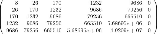 xvals = [-1,0,1,2,3,5,7,9] for p in range(9): print "%d: %8d" % (p,sum(xvals[n]^p for n in range(len(xvals))))0: 8 1: 26 2: 170 3: 1232 4: 9686 5: 79256 6: 665510 7: 5686952 8: 49208966In evaluating the matrix shown in equation (4) above, remember that this: