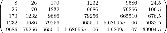 In my Sage code I create a square matrix equal in size to p+1, p being the solution's desired polynomial degree, then I add an extra column at the right whose purpose will be explained below. For this example, let's choose polynomial degree 4. Referring now to equation (4) above and to the example data set, I perform the operations required to produce this numerical matrix content: