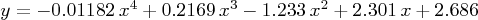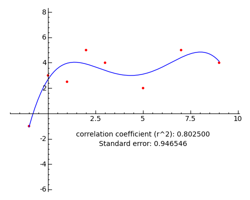@interact def _(p = (0..12)): y = polyregress(data,p) dp = list_plot([[data[n].x,data[n].y] for n in range(len(data))],rgbcolor='red') lp = plot(y,x,list_minmax(data)) cc = corr_coeff(data,y) se = std_error(data,y) lbl = text("correlation coefficient (r^2): %f\nStandard error: %f" % (cc,se),(5,-2),rgbcolor='black',fontsize=10) show(dp+lp+lbl,ymin=-5,ymax=7)A degree 4 result: