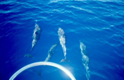 Some dolphins came to play yesterday evening. They swam around the boat and jumped in the air — an unbelievable dolphin show.