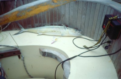 Bob and Ursula on Take Two contacted another German boat, "African Queen," on the radio, then we met them face to face in Torres Strait. We decided to try catching some fish, then get together for dinner. So I put out about 100 feet of rather heavy nylon fishing line and a plastic squid on a stainless steel leader with a little lead weight. I had previously used a shorter line, but Ursula told me she uses a longer line to keep the lure out of the boat's wake, making it easier for fish to see. Anyway, after I took this advice I barely got the line in the water when a big fish took hold. Ursula caught one about the same size, so there was plenty of fish for dinner.