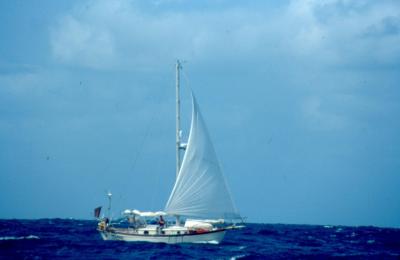 Now that I have compared the simple, elegant wind vane with my electronic contrivance whose little motor might fail any time, I think it only fair to point out that Bob and Ursula on Take Two have switched from their decent wind vane to an auto pilot like mine. During this voyage I had been steadily gaining on them, about ten miles per day, even though their boat is unquestionably faster (because it weighs less and has a fin keel and spade rudder). Then they decided to try out their new electronic toy, freshly acquired in Fiji, and I am no longer gaining on them. The drawback to a wind vane is that when the wind changes direction, the boat does too. Now that their boat is moving in a straight line, their effective speed has gone up, and I can't close the gap between us.
