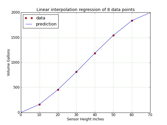Here is an example of a linear interpolation (blue line) based on the same tank data set described above (red dots):