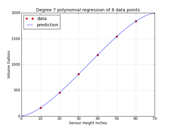 Here is a graph that shows the relationship between a handful of tank measurements (red dots) and the polynomial function's resulting prediction (blue line):