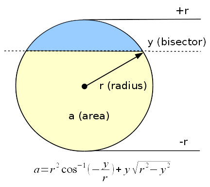 (3) $ \displaystyle f(y) = r^2 \cos^{-1} \left(-\frac{y}{r} \right) + y \sqrt{r^2-y^2} $ (circle partial area, equation (2))