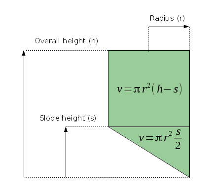(7) $ \displaystyle v = \pi r^2 \frac{s}{2} $ (sloped section volume)